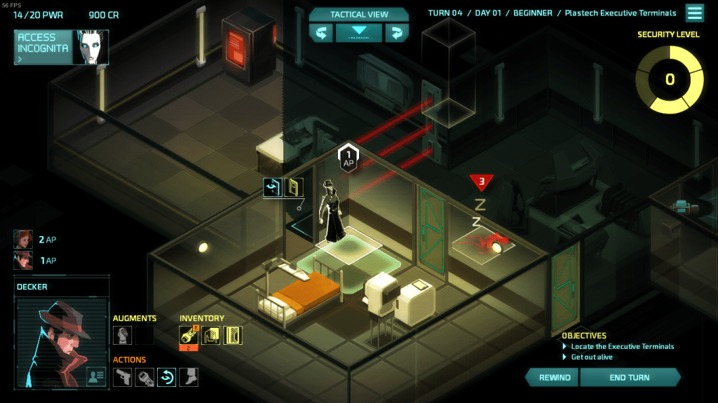 Invisible, Inc. is a turn-based tactical stealth game. The characters in this game are player controlled remote operators for an spying agency which is being attacked from multinational corporations. You start by selecting your team with two agents to begin with. You can unlock a list of agents based on different playthroughs and experience you have earned. Each of the agents has a different set of equipment to start with, a different set of stats and is usually equipped with a skill specific to themselves such as cloaking. If one of them is dies during the mission, you can either revive them back to life or will have to drag their stupid ass to the exit.